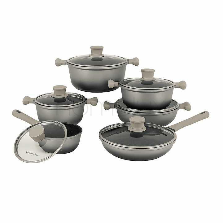 A premium 12-piece cookware set in elegant black and grey, designed to meet all your everyday cooking needs.