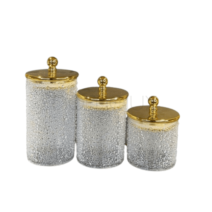 This set of three sealed jars with golden lids is designed for multifunctional storage, making it perfect for keeping dried fruits, nuts, spices, or other food items fresh and organized. The airtight lids ensure that contents remain sealed, preserving their flavor and extending shelf life. Crafted from high-quality, durable materials, these jars offer both practicality and elegance, with their clear design allowing easy visibility of contents. Ideal for kitchen counters, pantries, or as decorative storage, these containers combine convenience with a touch of sophistication.