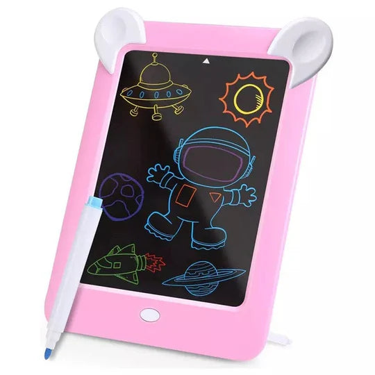 This environmentally friendly transparent drawing board is smooth, wear-resistant and not easy to scratch, and it can be wiped repeatedly with a wiping cloth to avoid wasting paper. The built-in soft eye-protection lights will turn on the power button to turn on the cool lights around the drawing board after drawing. The rear suction cup is strongly adsorbed, and the strong adsorption effect can suck on the smooth surface of the object and it is not easy to fall. The bracket design is a fun decoration, and the hidden bracket on the back is not only a drawing board, but also a decoration. When the painting is placed in the living room, a sense of pride arises spontaneously. Each time you press it, change one color light, the last one press, several light cycles flash.
