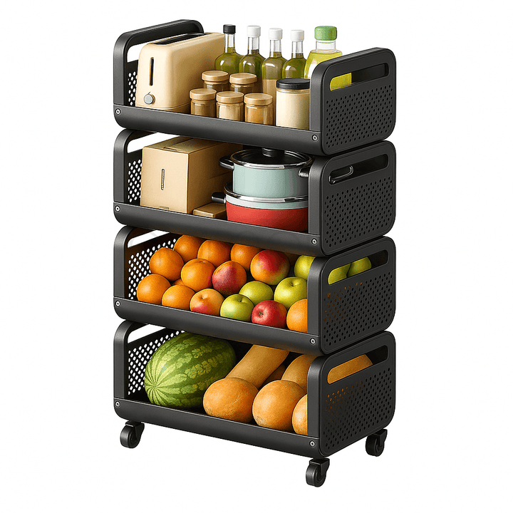 This is a compact yet robust 4-layer storage solution designed to maximize vertical space in smaller kitchens, pantries, or utility areas. The unit features four deep, detachable basket-style shelves that stack securely on top of each other. Each basket is made from durable black iron or carbon steel and features a distinctive perforated/mesh design on the sides, which promotes excellent air circulation—ideal for keeping fruits, vegetables, and linens fresh.