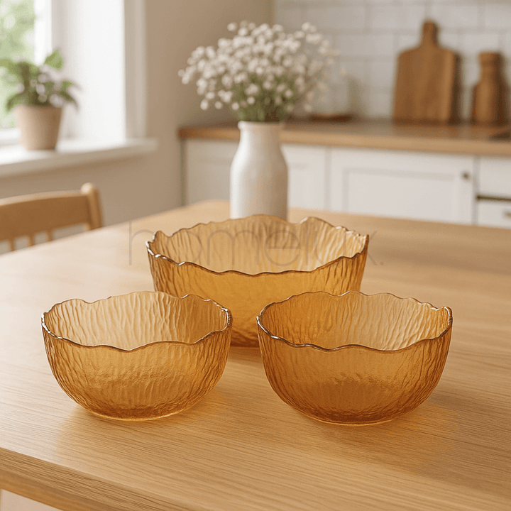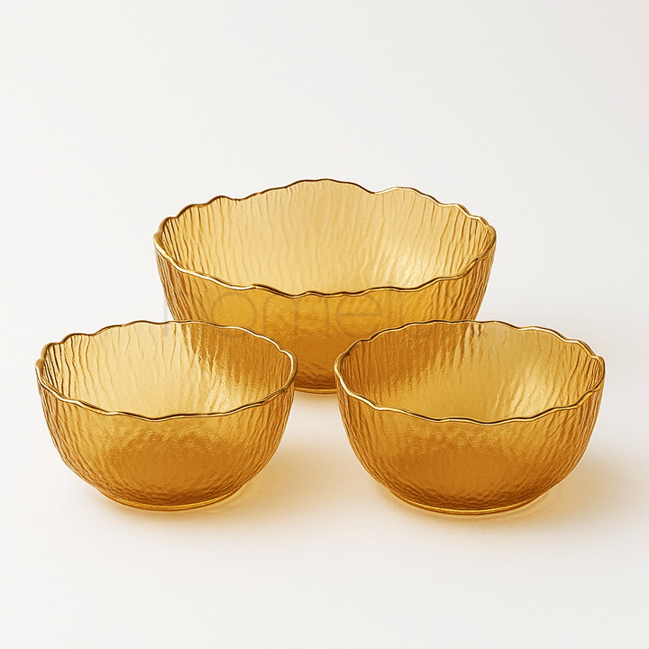 This is an elegant seven-piece glass serving set from the More & More collection, distinguished by its warm, translucent amber coloring. The set is highly functional for entertaining, comprising one large serving bowl intended for main sides or salads, accompanied by six smaller condiment bowls for dips, nuts, or individual portions. All pieces share a striking, artisanal aesthetic, featuring a deeply textured, vertical ripple or crinkle pattern across the glass surface. Each bowl is finished with a delicate gold rim tracing the naturally irregular, wavy edge, lending a sophisticated touch to the rustic design.