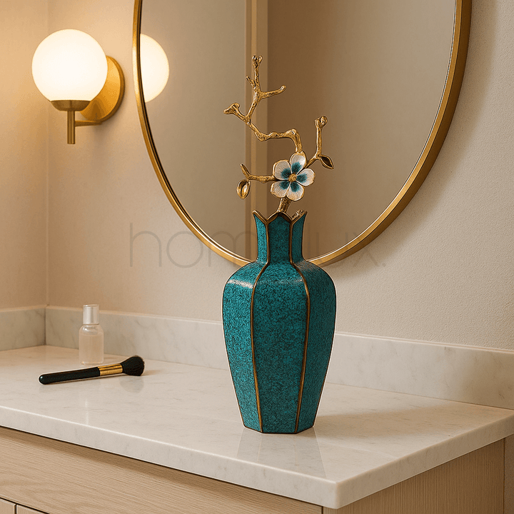 This elegant vase is more than just a decorative piece; it's a work of art. The vase features a unique faceted design in a rich, speckled turquoise with lustrous gold accents along its ridges. The centerpiece is a separate, sculpted metal branch with a delicate blue blossom and leaves, giving the impression of a perpetually blooming flower. This unique blend of ceramic and alloy craftsmanship makes it a sophisticated focal point for any room.