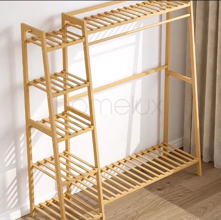 - This multifunctional coat hanger is equipped with 1 top shelf,1 hanging rod,1 bottom shelf, 5-tier storage shelf to give you more storage options! Top hollow shelf, expand the storage area, make full use of space. Top rod provides sufficient space to hang any long pants, overcoats and dresses without wrinkles. Widen and thicken bottom shelf is convenient to organize shoes, box, suitcases, 5 tires storage shelves are handy for keeping hats, handbags, towels, get rid of confusion