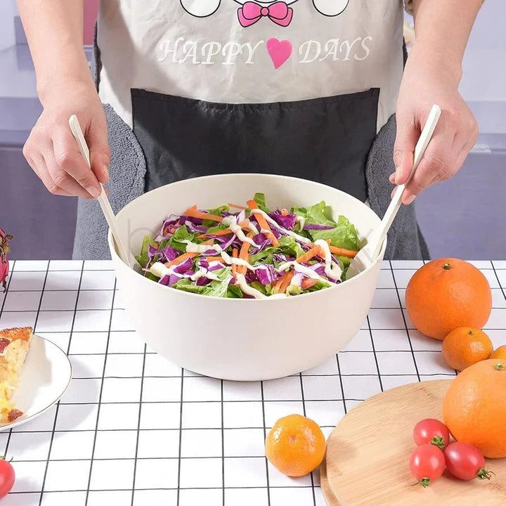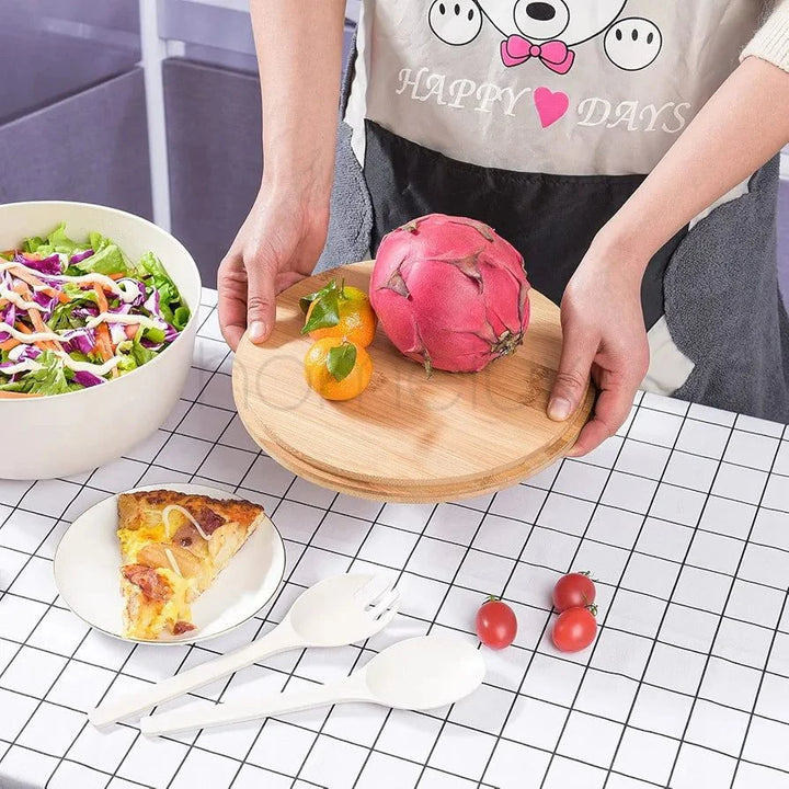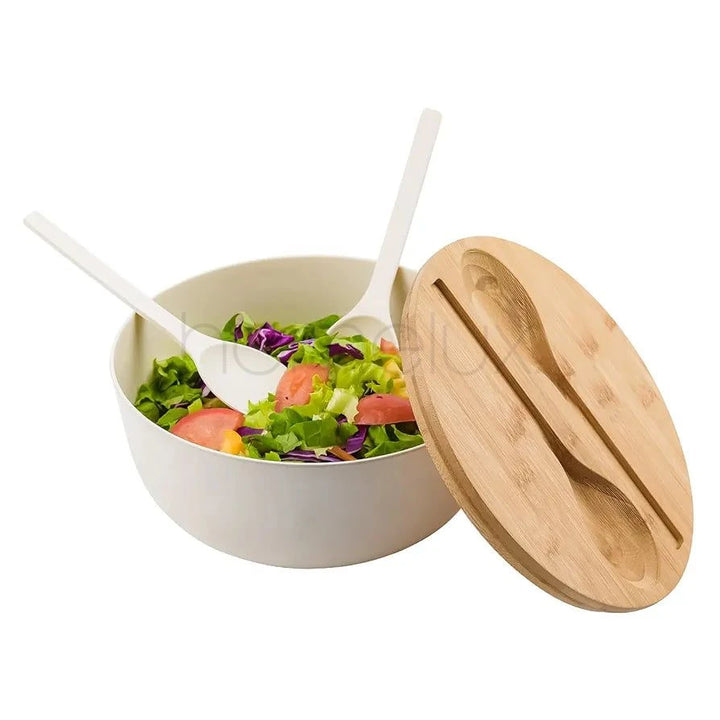 SALAD BOWL SET: This salad bowl with lid includes an extra-large bowl, a serving spoon, a fork, and a lid. The lid includes an indentation for our spoon and fork, resulting in convenient storage. Our double-sided bamboo lids of a large salad bowl can be used as a cutting board.