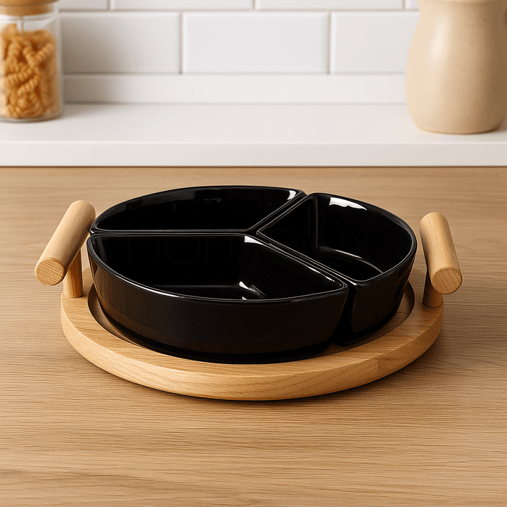 This modern serving tray features three glossy black ceramic bowls, neatly arranged on a round wooden base with sturdy side handles. Designed for both style and practicality, it’s perfect for serving dry fruits, snacks, sauces, or condiments in an organized way. Its sleek look and compact size make it a versatile addition to everyday dining as well as festive occasions.
