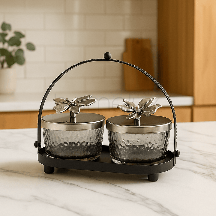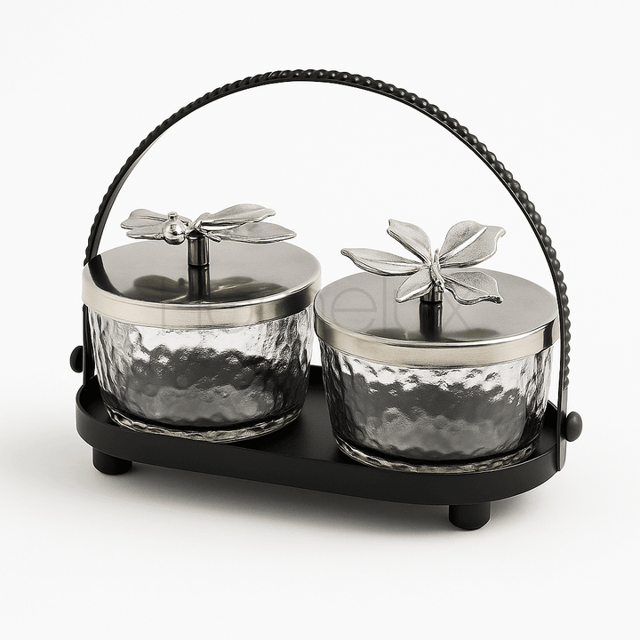 This modern 2-piece condiment set features textured glass bowls with silver-finished lids, each adorned with a beautiful butterfly design. The bowls sit securely in a sleek black stand with a curved handle for easy carrying. Perfect for serving sauces, spices, pickles, or dry fruits, this set combines contemporary elegance with practical everyday use.