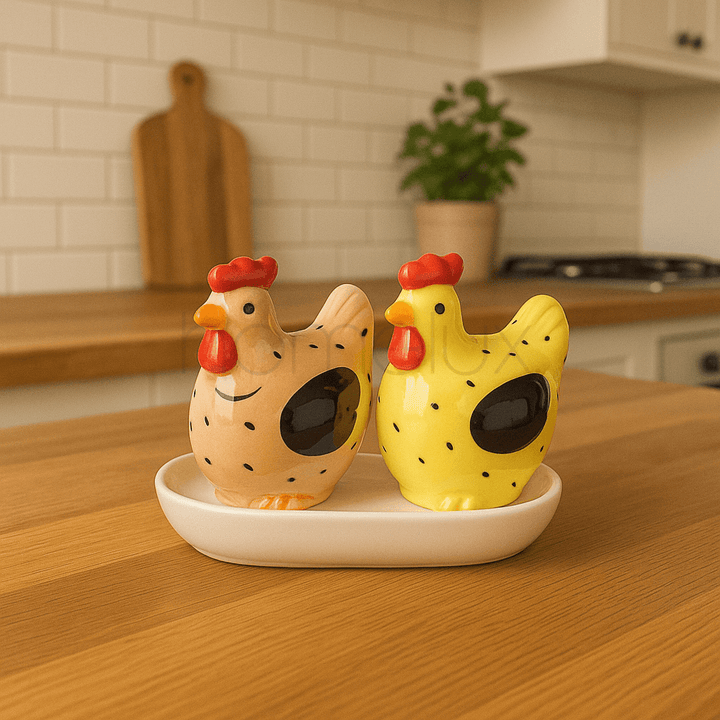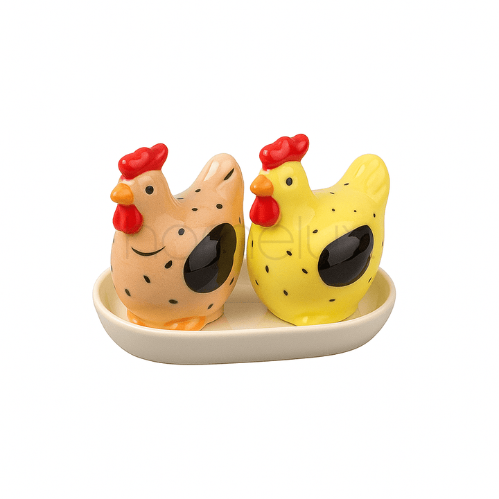 A whimsical and colorful set of two ceramic seasoning shakers, shaped and painted like speckled hens or chickens. The set includes one light tan hen and one light yellow hen, both featuring a bright red comb and wattle, and black speckled detailing. The unique poultry design adds a fun, rustic, or farmhouse charm to any kitchen or dining table. The shakers sit securely on a small, oval-shaped ceramic tray, making them easy to carry and keeping them neatly organized.