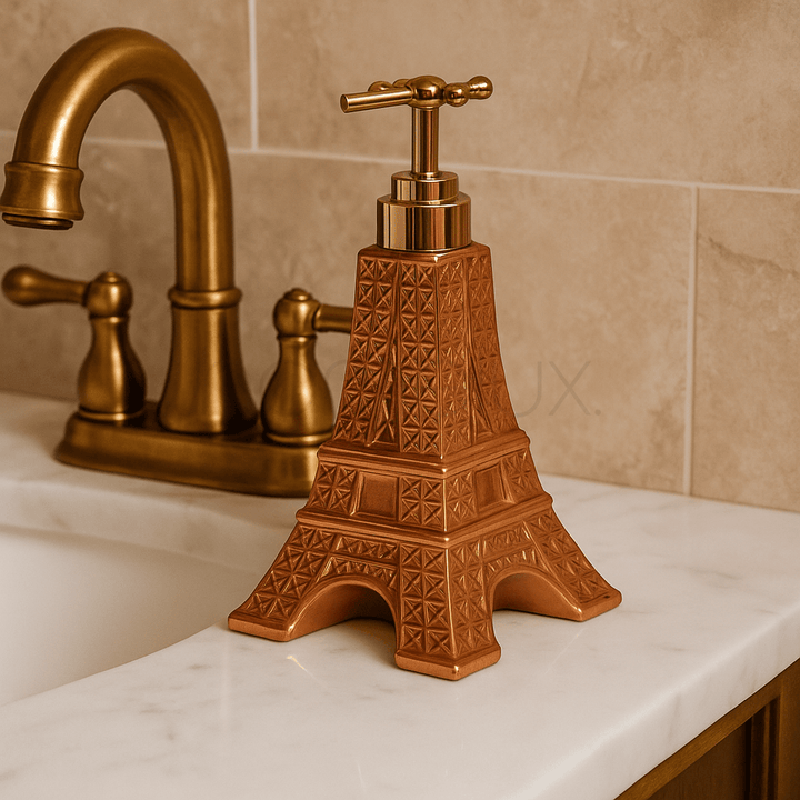A highly decorative and unique liquid soap dispenser crafted in the iconic shape of the Eiffel Tower. This refillable dispenser is finished in a trendy, highly-reflective rose gold or copper tone, giving it a luxurious, metallic look. The body features intricate, embossed geometric patterning that mimics the tower's structure, and it is topped with a coordinating pump mechanism. This piece is perfect for adding a touch of Parisian elegance and novelty to a bathroom vanity or kitchen sink.
