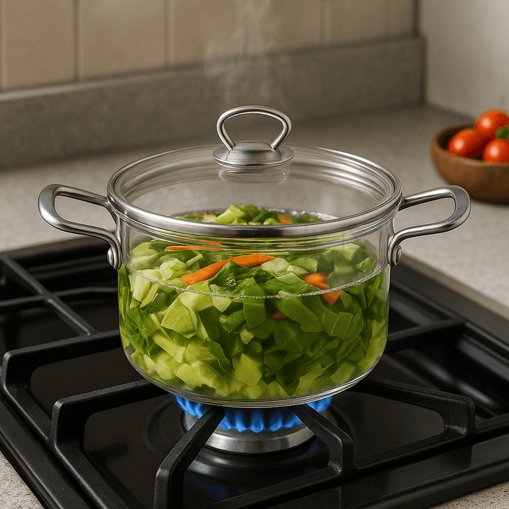 Elevate your kitchen with the Clarity Cooking Pot. This elegant, see-through pot is crafted from heat-resistant glass, allowing you to monitor your food as it cooks without lifting the lid. Its sleek design, combined with durable stainless steel handles and a glass lid, makes it a beautiful and practical addition to any stovetop. Whether you're simmering sauces or boiling vegetables, this versatile pot makes cooking effortless and stylish.