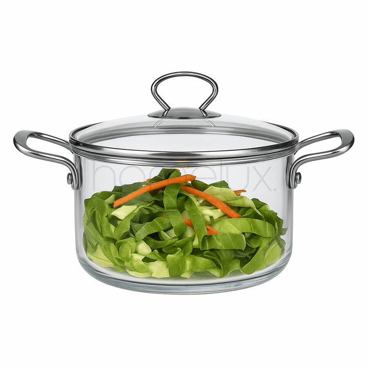 Elevate your kitchen with the Clarity Cooking Pot. This elegant, see-through pot is crafted from heat-resistant glass, allowing you to monitor your food as it cooks without lifting the lid. Its sleek design, combined with durable stainless steel handles and a glass lid, makes it a beautiful and practical addition to any stovetop. Whether you're simmering sauces or boiling vegetables, this versatile pot makes cooking effortless and stylish.