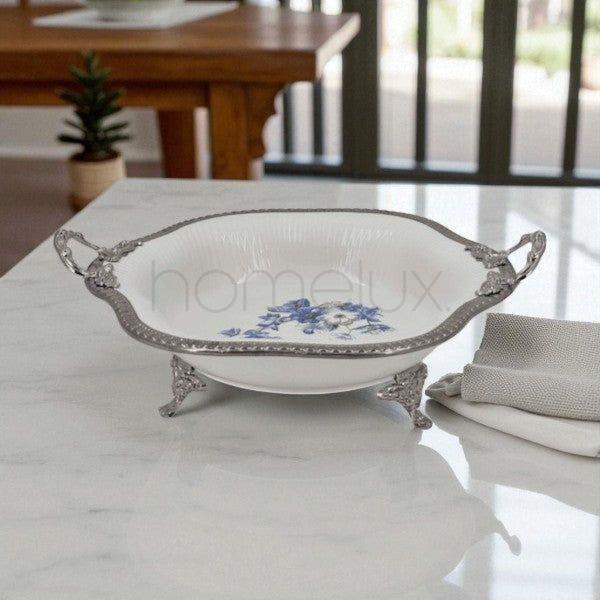 This elegant pure white bowl features delicate floral designs, complemented by two sleek silver legs and matching silver handles. Its refined craftsmanship combines aesthetic appeal with practical stability, making it an ideal choice for serving or display in sophisticated settings. The silver accents enhance durability while adding a touch of luxury to your tableware collection.