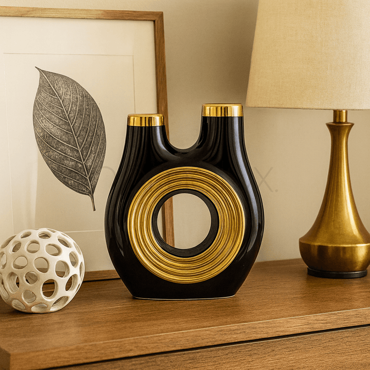 Add a touch of elegance and sophistication to your interiors with the Ebon Luxe Ceramic Vase. Designed with a bold glossy black finish and highlighted by golden concentric rings, this modern decorative vase is the perfect blend of luxury and contemporary design. Its unique circular cut-out center and dual top openings make it not only a functional piece but also a stunning work of art for your home décor.