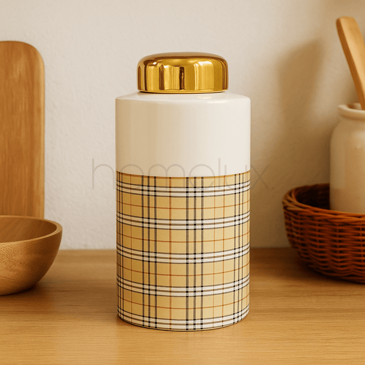 A premium extra-tall ceramic candy jar featuring a cream upper half and a classic beige plaid checkered base, finished with a glossy golden lid. Its elongated cylindrical design offers greater storage space, making it perfect for keeping candies, cookies, dry fruits, tea, or snacks. With its plaid pattern and golden detailing, it doubles as a decorative accent piece for your kitchen, dining table, or living room.