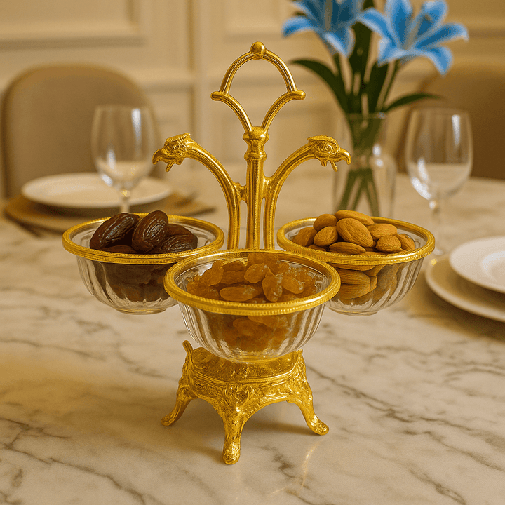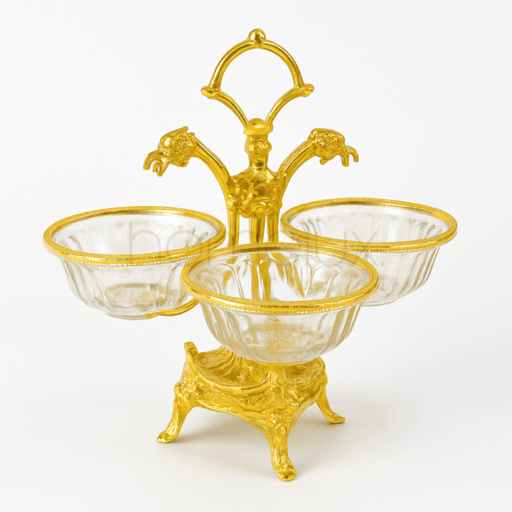 - Material: Golden-finished glass bowls on a gilded metal alloy stand.
