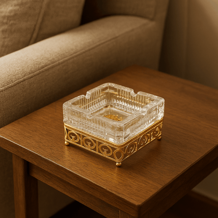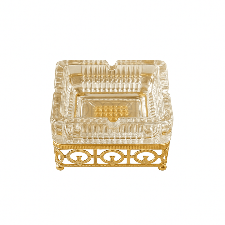 This elegant ashtray is designed to be a luxurious accent piece. It features a stunning, square crystal bowl with a beautifully textured, faceted pattern that catches the light. This heavy-duty glass piece rests securely in a separate, ornate golden stand with a delicate lattice design. The combination of the clear crystal and the polished gold creates a sophisticated, classic look, making it a perfect addition to any desk, coffee table, or lounge.