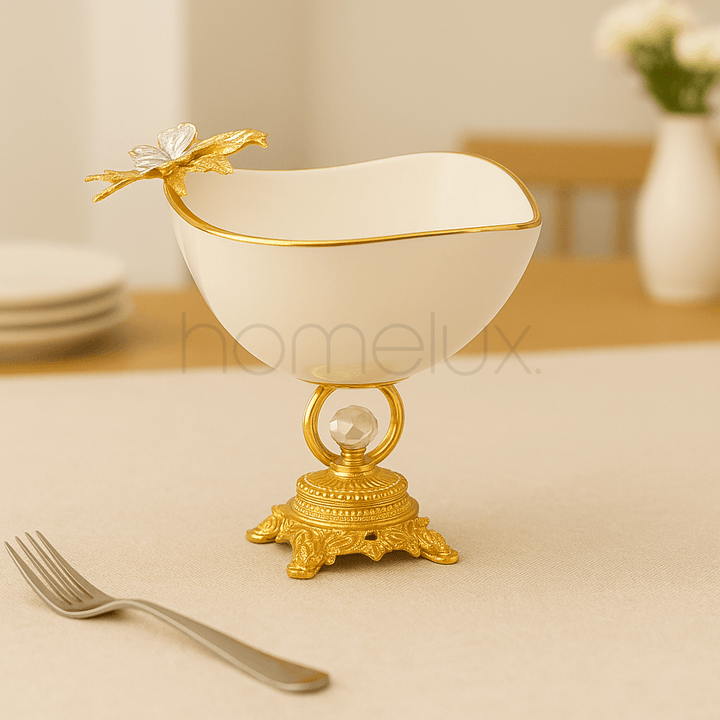 This elegant serving bowl is a stunning centerpiece for any table. It features a smooth, oval-shaped porcelain bowl with a delicate gold rim. The bowl rests on a highly ornate, gilded metal stand that adds a touch of intricate detail and luxury. A sculpted, metallic floral or butterfly detail on the side of the bowl completes this sophisticated design.