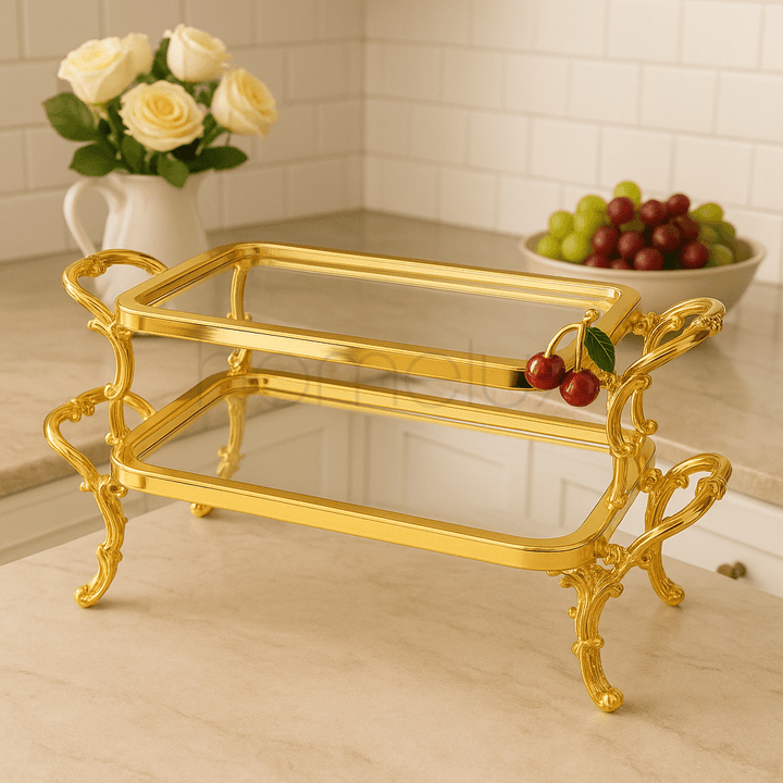 This exquisite serving tray is a showstopping piece for any occasion. It features a rectangular glass dish with a ridged pattern, set within an ornate, gilded metal frame. The tray's stand has intricate scrollwork and a charming cherry-shaped accent on the side, adding a touch of playful sophistication. With its built-in handles, this piece is both beautiful and functional for serving food or simply as a decorative centerpiece.