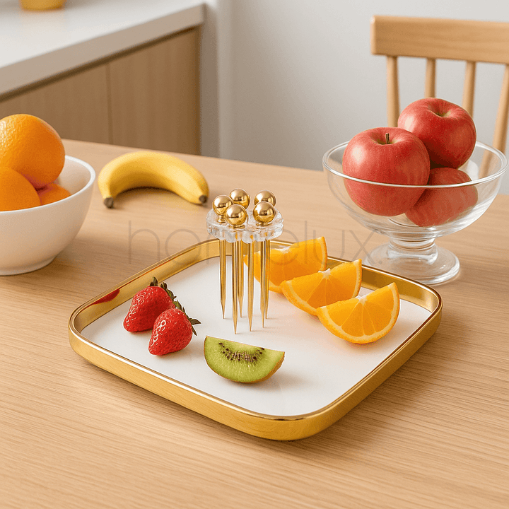 This elegant serving set is a perfect blend of style and practicality. The platter features a clean, square design with gently rounded corners and a pure white surface, all framed by a bold, polished gold rim. The centerpiece is a unique stand that holds several matching fruit forks with golden orb handles. This set is ideal for serving fresh fruit, desserts, or appetizers, making every occasion feel a little more luxurious.