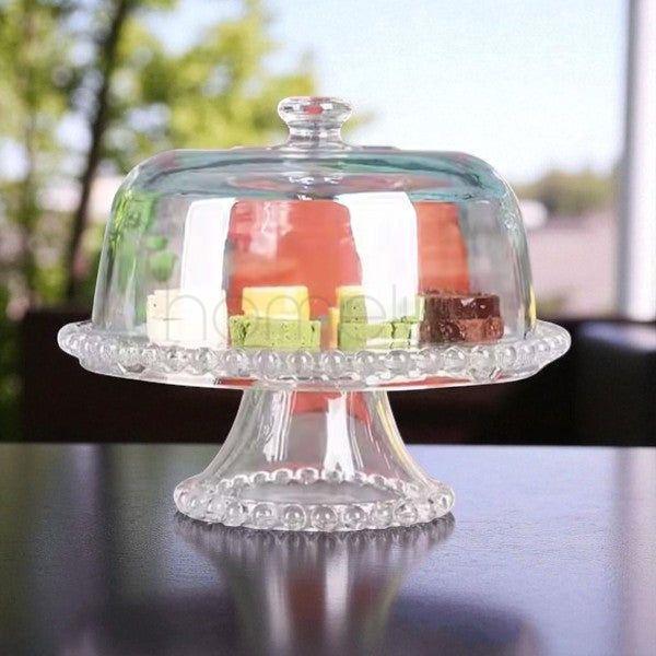 An elegant glass cake plate, perfect for serving and presenting cakes, pastries, and desserts.