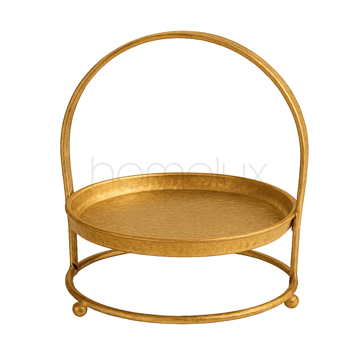 This decorative serving bowl features a round, shallow, gold-toned dish with a distinctive, hammered texture. The dish sits on a small round base with ball feet and is characterized by a high, arched handle with a rope-like texture. This piece is both functional and decorative, suitable for serving small candies or nuts, or simply as an ornamental dish.