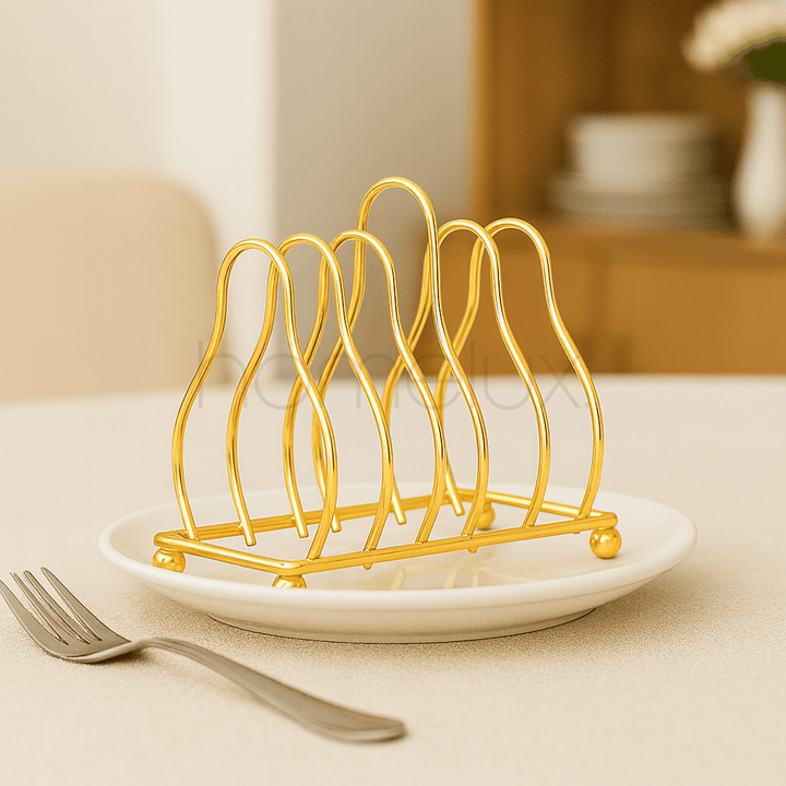 This compact and elegant toast rack is a perfect addition to any breakfast or brunch table. Made from a durable metal alloy, it features a highly polished gold finish that adds a touch of luxury. The design includes four graceful arches that securely hold slices of toast, while the simple, rounded base ensures stability. It's both a practical serving piece and a beautiful decorative accent.