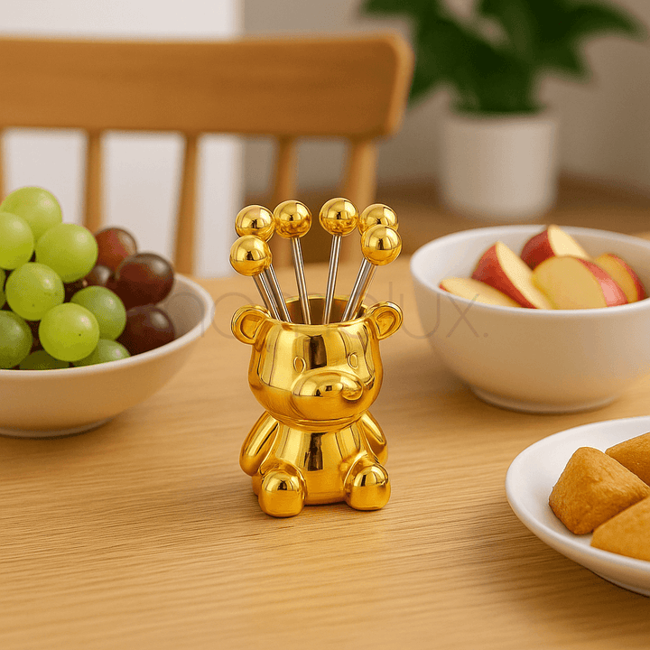 - Design: A small bear figurine holder with an opening on top to store several fruit picks.