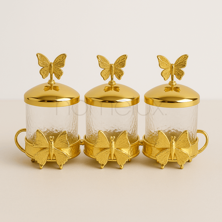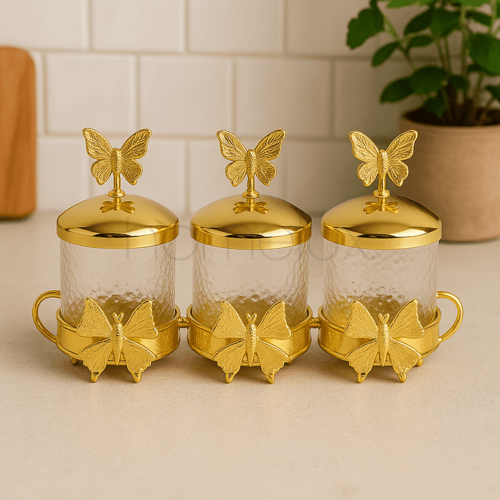 This elegant 3-in-1 condiment set features beautifully designed small jars adorned with golden butterfly accents. Each jar comes with a matching gold lid topped with a butterfly handle, making it both decorative and functional. Ideal for serving condiments, spices, dry fruits, or small snacks, this compact set brings a luxurious charm to any dining or kitchen setup.