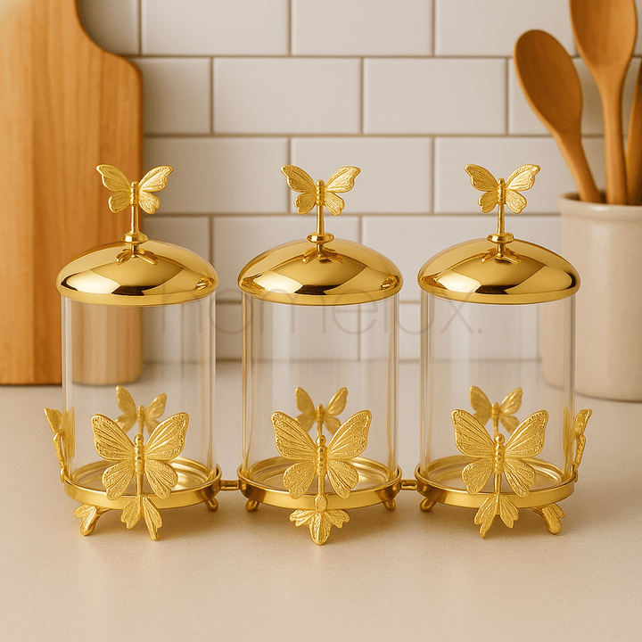 A beautifully crafted 3-piece glass condiment set adorned with golden butterfly accents. Each jar features a clear glass body with a golden lid and butterfly-shaped embellishments, making it perfect for storing and serving spices, condiments, or dry fruits. The elegant design adds a touch of luxury to any dining or kitchen setting, making it both decorative and practical.