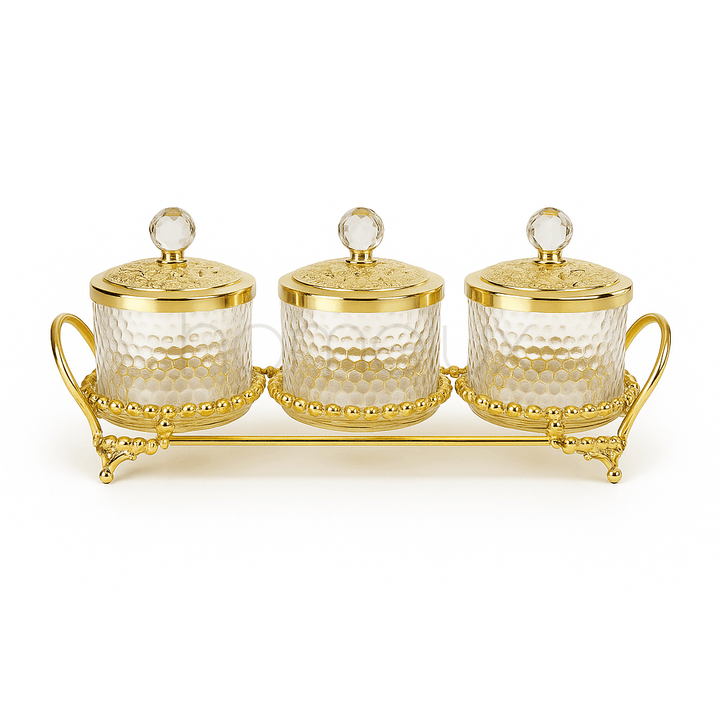 This elegant 3-piece condiment set features hammered glass bowls with golden lids, each topped with a crystal knob for a luxurious touch. The bowls sit in a decorative golden stand with ornate detailing, making it not only a functional serving piece but also a striking centerpiece for any table. Perfect for condiments, sauces, spices, dry fruits, or sweets, it blends luxury with everyday practicality.