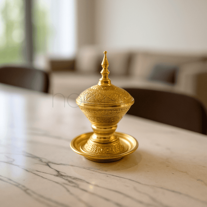 An exquisitely designed golden serving holder with a royal finish. Crafted with intricate detailing, it comes with a base tray and an ornate dome-shaped lid topped with a pointed finial. Perfect for serving dry fruits, sweets, or as a decorative accent for festive occasions and special gatherings.