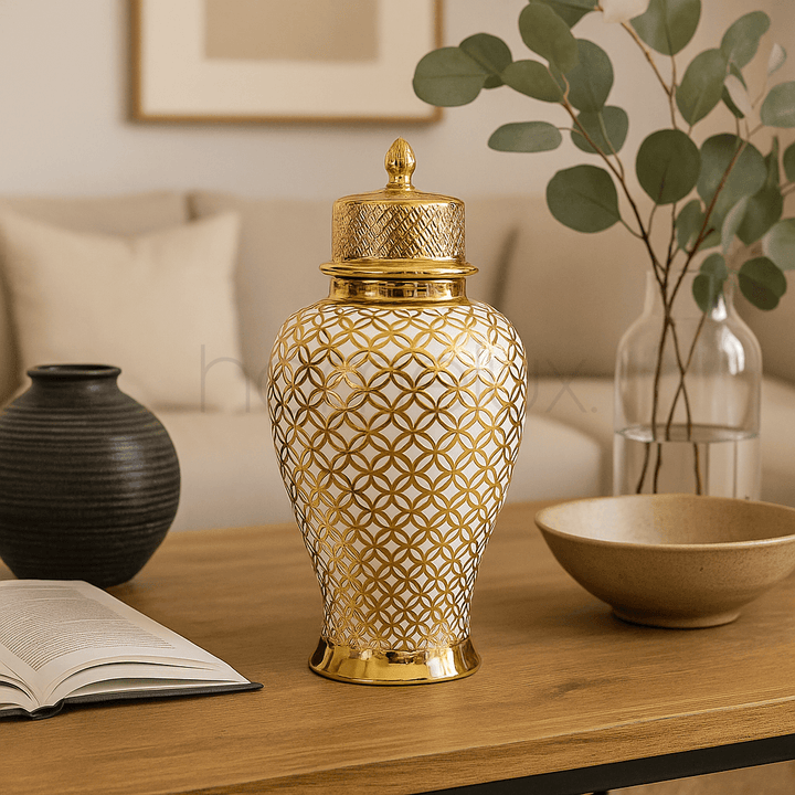 A beautifully crafted golden ceramic jar featuring a lattice-inspired embossed pattern. The glossy finish and elegant shape make it a perfect blend of tradition and modern luxury. With a matching golden lid and finial top, this jar is designed to be a centerpiece for any space — whether on a dining table, console shelf, or living room décor.