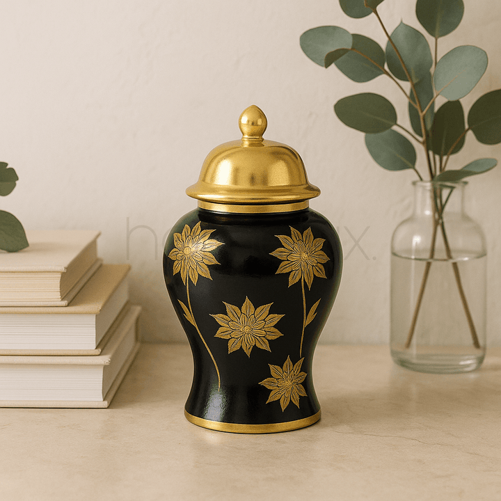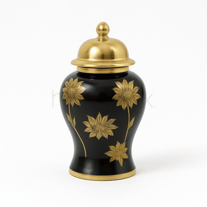 This jar captures a sense of timeless elegance with its classic form and stunning detail. The smooth black finish serves as a dramatic backdrop for the intricate gold leaf pattern that decorates its surface. The shimmering gold lid complements the foliage design, creating a harmonious and luxurious look. This piece is a beautiful way to bring a touch of nature-inspired sophistication to any room.