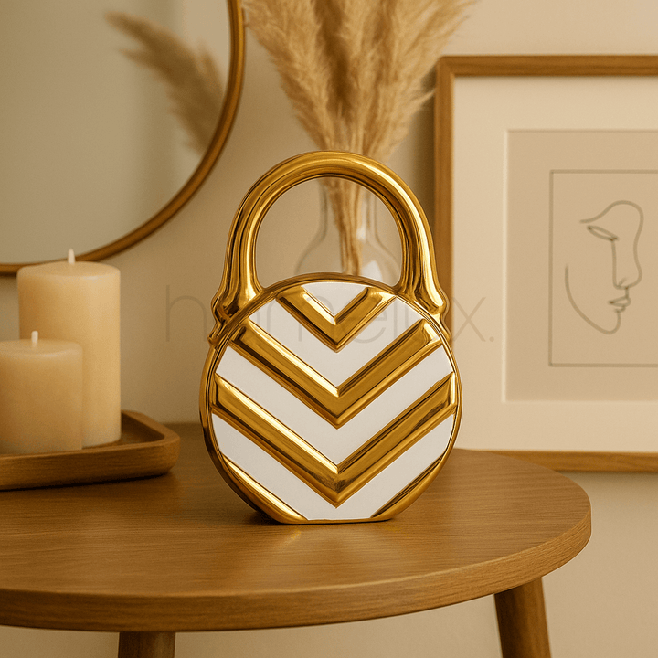 The Golden Lock Accent Vase brings a bold and modern edge to home décor. With its padlock-inspired silhouette and glossy golden finish contrasted by white chevron detailing, this unique piece is designed to stand out. Whether styled on a console table, shelf, or centerpiece, it adds a luxurious, conversation-starting touch to any interior.