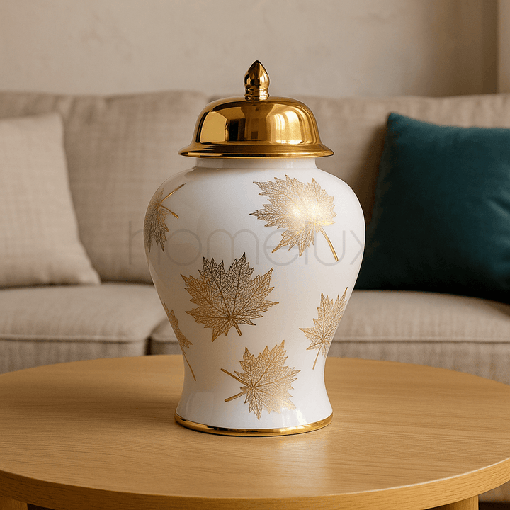 - Design: Classic ginger jar silhouette with a detailed golden maple leaf pattern and a polished, removable lid.