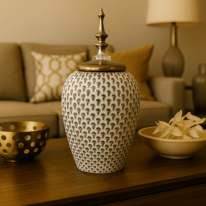 The Grande Silver Embossed Jar is a luxury decorative accent, blending timeless artistry with modern elegance. Its tall structure features an embossed dotted texture all over, finished with a polished silver lid and ornate finial, making it a striking centerpiece for sophisticated interiors.
