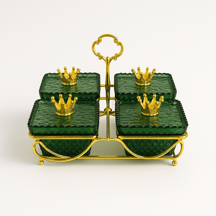 This elegant 4-piece condiment set is crafted from textured green glass bowls, each topped with a golden crown lid. The square-shaped bowls are arranged in a polished golden stand with a decorative handle for easy carrying. Perfect for condiments, dry fruits, spices, or sweets, this set adds a royal touch to your dining table while offering both style and functionality.