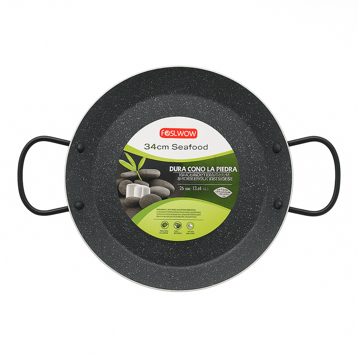 This wide, shallow pan is an ideal tool for cooking and serving large, communal meals like paella, seafood, risottos, or large family-sized stir-fries. It features a durable, speckled "stone-effect" non-stick coating for excellent food release and quick cleanup. The pan has a wide diameter and two large loop handles, allowing it to be safely and easily transported directly from the stovetop to the dining table.