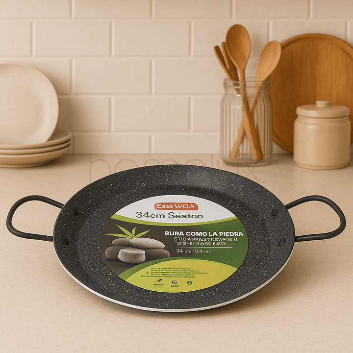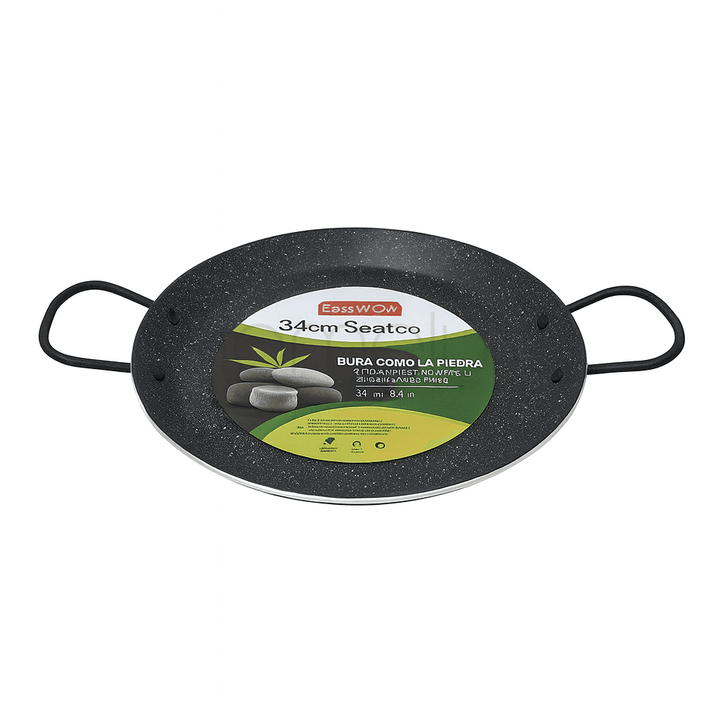 This wide, shallow pan is an essential cooking and serving vessel, ideal for paella, seafood, risottos, or large family-sized meals. It is a pan featuring a speckled "stone-effect" non-stick coating for excellent food release. The design includes two large loop handles, allowing it to be securely transported and presented directly from the stovetop to the table.