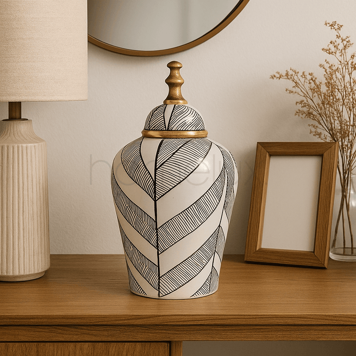 An elegant ceramic jar with a tall, curved silhouette and a detailed hand-drawn leaf pattern in black on a white glossy surface. The jar is topped with a unique finial lid, finished in a natural wooden tone with golden accents, adding charm and sophistication. Perfect as a decorative centerpiece, this jar can also be used for light storage or simply as an accent piece in your living room, dining area, or entryway.
