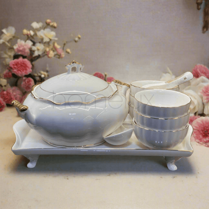 Soup Tureen: The centerpiece of the set, the soup tureen, is large enough to hold a family-sized portion of soup, complete with a lid to keep the contents warm.
