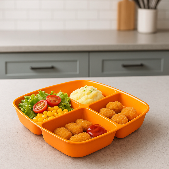 Its bright orange color adds a cheerful touch to any kitchen setup. Designed with curved edges and a stable base, it’s ideal for everyday meals, snacks, picnics, and lunchboxes. Whether used at home or outdoors, this plate ensures cleanliness, convenience, and style.