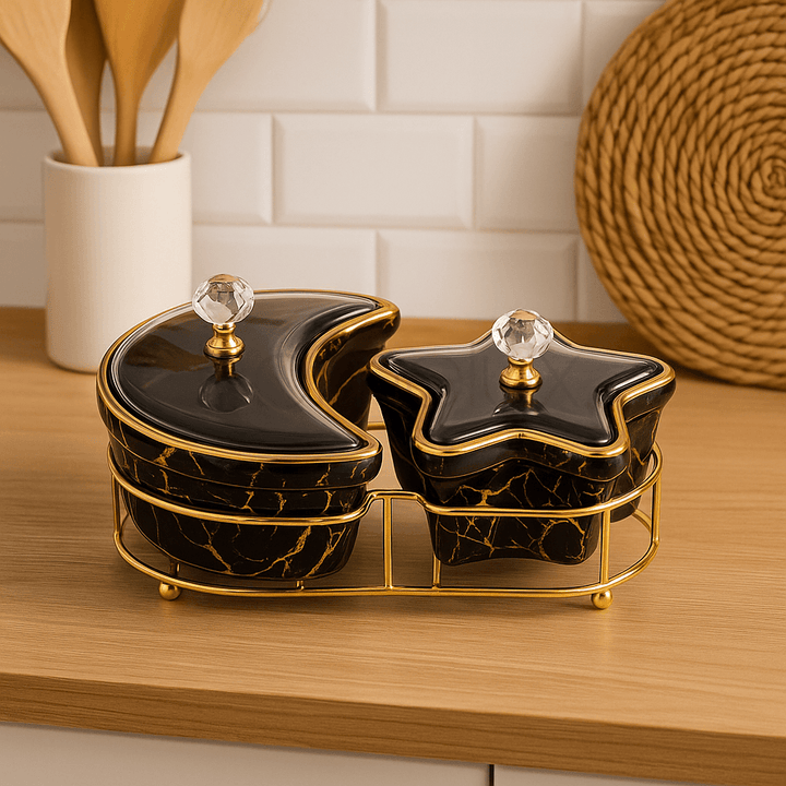 This luxury 2-section serving dish is designed in a celestial moon and star theme, crafted from glossy black marble-effect ceramic with golden veining. Each bowl is topped with a crystal knob lid and rests elegantly in a golden stand. Compact yet stylish, this set is perfect for serving dry fruits, condiments, sweets, or snacks, making it both practical and decorative for modern and festive dining.