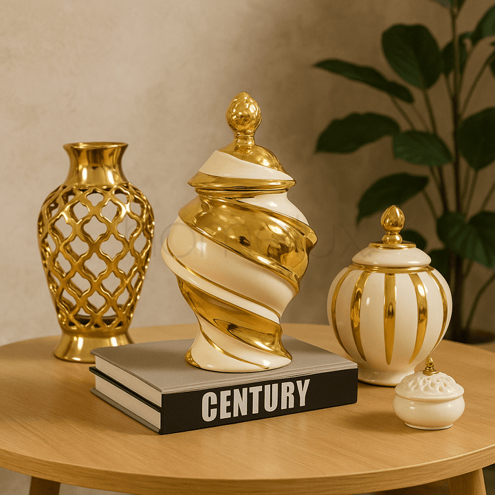 An elegant ceramic decorative jar featuring a unique spiral twist design with glossy white and golden finish. The artistic shape and shiny surface make it a perfect luxury décor piece as well as a functional candy jar or centerpiece.