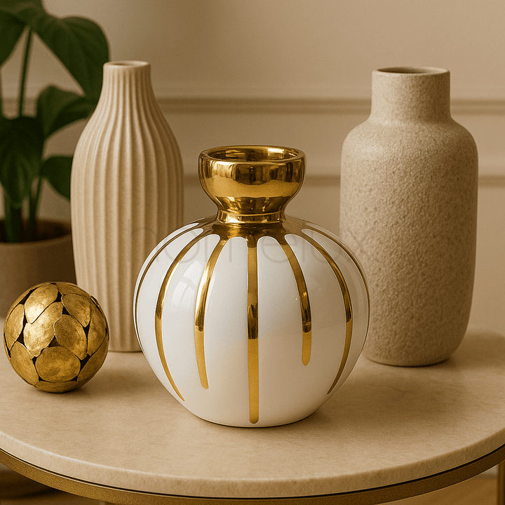 A modern and elegant round ceramic vase featuring a glossy white finish with striking gold-plated stripes. Its contemporary design makes it a perfect centerpiece for luxury home décor, adding a touch of sophistication to any space.