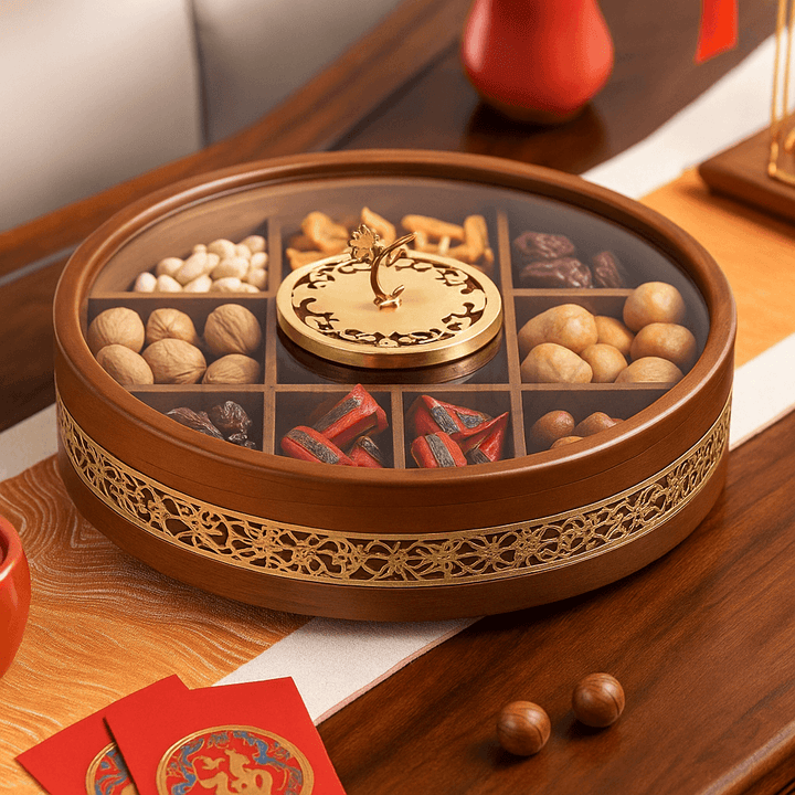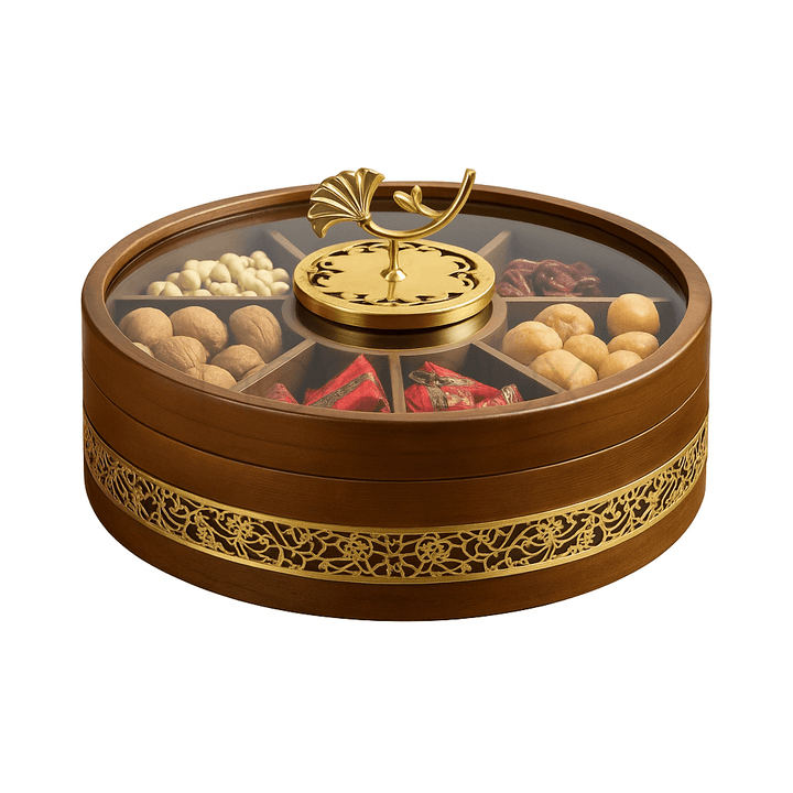 Store and serve your favorite snacks in style with this premium wooden dry fruit box. Featuring a polished wooden base, a transparent glass lid, and an ornate golden handle, this elegant organizer comes with multiple compartments to keep dry fruits, nuts, and sweets neatly separated. Perfect for festive occasions, guests, or everyday luxury dining.