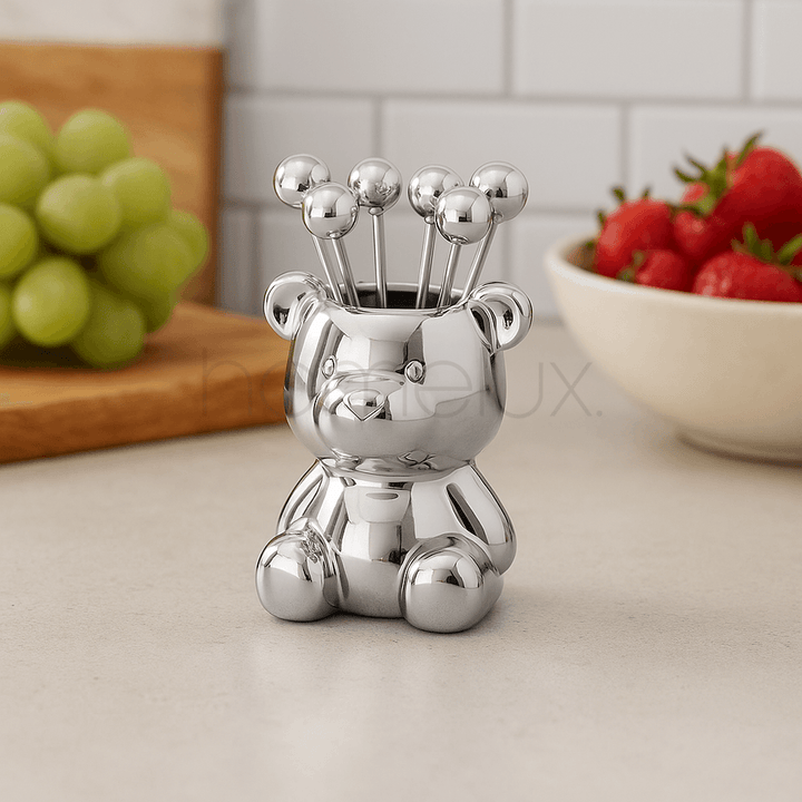 - Design: A small bear figurine holder with an opening on top to store several fruit picks.