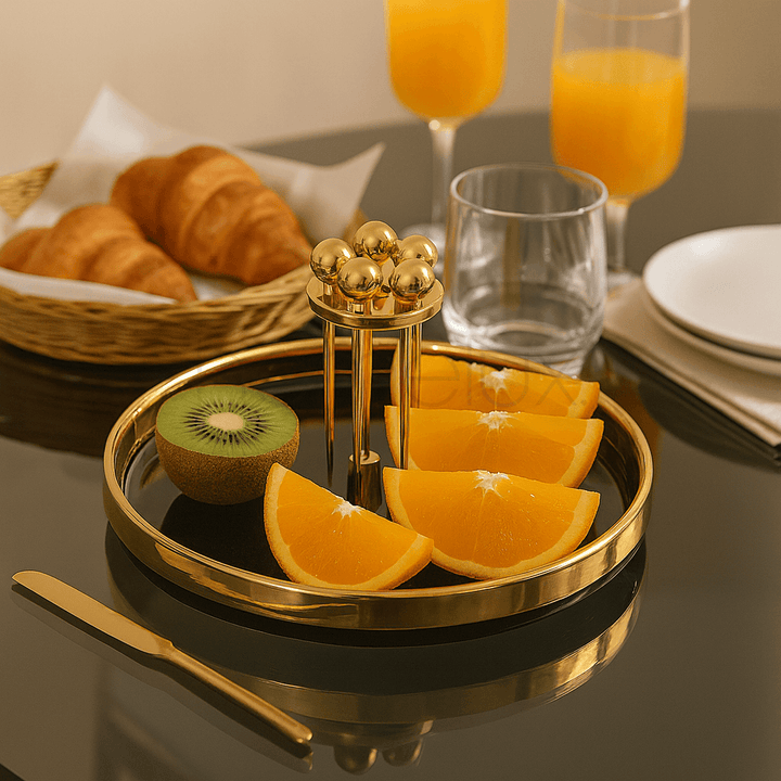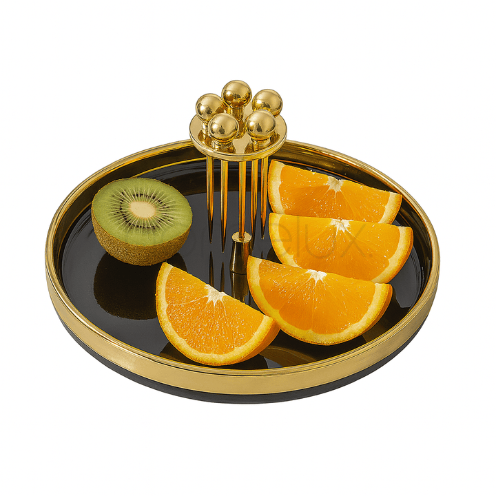 This elegant serving set is a perfect blend of bold design and practical elegance. The platter features a timeless round design with a sleek, glossy black surface, all framed by a thick, polished gold rim. The centerpiece is a unique stand that holds several matching fruit forks with golden orb handles. This set is ideal for serving fresh fruit, desserts, or appetizers, making every occasion feel a little more luxurious.