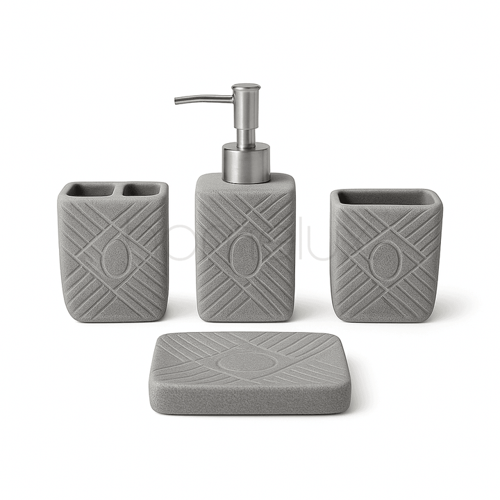 A clean and contemporary bath accessory set that achieves a spa-like aesthetic by combining smooth white ceramic (or resin) with warm natural bamboo accents. The set includes a square liquid dispenser with a chrome pump, a square tumbler/holder, a soap dish, and a unique accessory stand. Each main piece is labeled with phrases like "LOTION" and "WASH," adding functional clarity. This collection is perfect for creating a relaxed, modern, and nature-inspired look on any bathroom or kitchen counter.