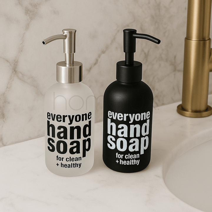 A contemporary, reusable liquid soap dispenser featuring bold, contrasting typography that reads "everyone hand soap" for a minimalist, modern aesthetic. The dispenser has a classic rounded bottle shape and is topped with a sleek, durable chrome-finish pump. It is ideal for dispensing hand soap, lotion, or sanitizer in the bathroom or kitchen. The dispenser is available in classic contrasting colors, such as a matte black or a frosted white, ensuring it blends seamlessly with modern decor.