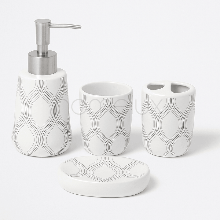 A contemporary bath set featuring a unique textured, light grey/blue finish with an embossed geometric pattern and a central oval medallion. The pieces have a modern, subtly angled shape. This coordinated collection includes a square liquid soap/lotion dispenser with a brushed metallic pump, a multi-slot toothbrush holder, a tumbler, and a matching rectangular soap dish. The matte, textured surface and minimalist color scheme give the set an earthy yet modern industrial appeal.